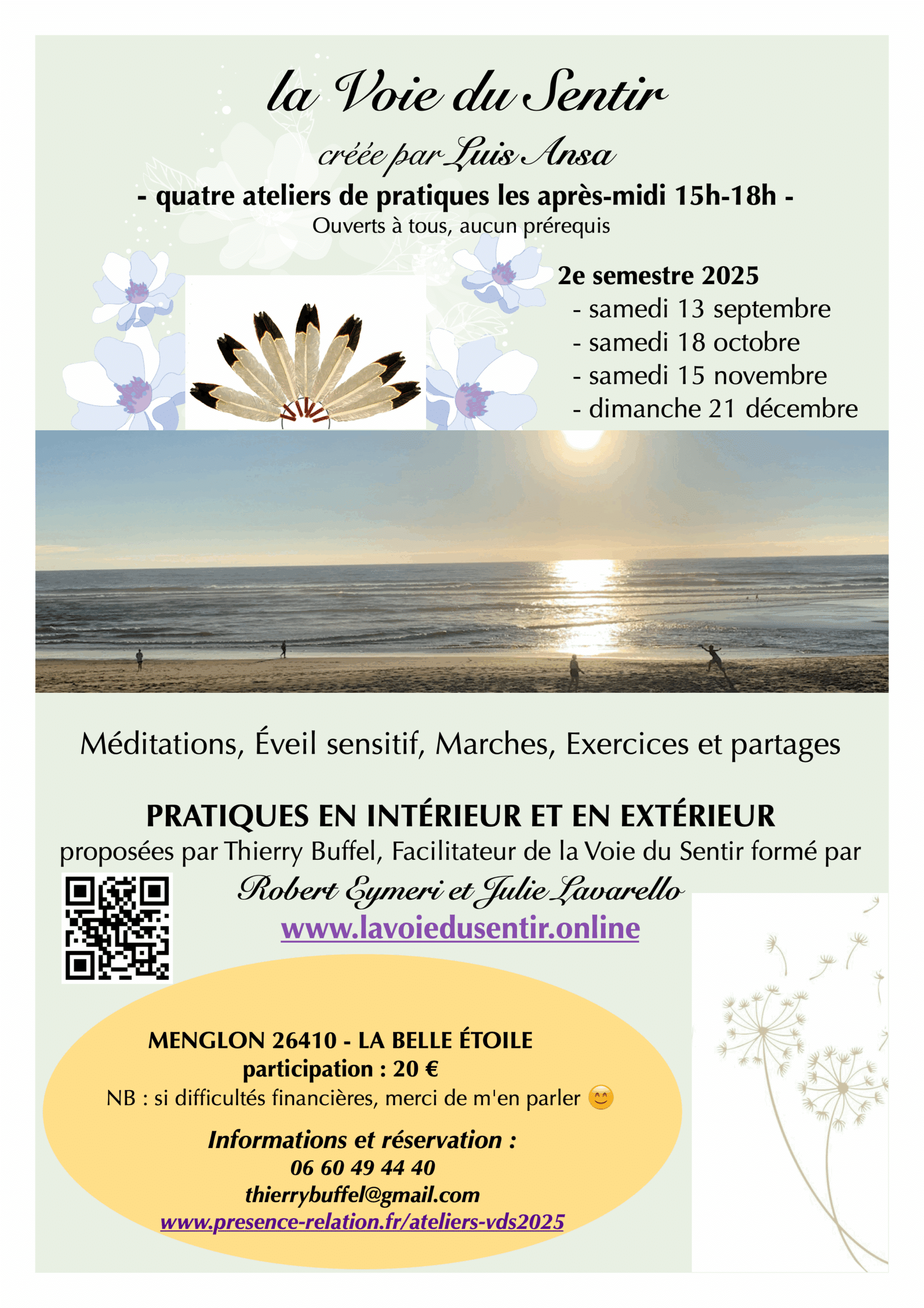 Thierry Buffel vous propose pour le 2e semestre 2025 : une série de 4 ateliers (1 par mois) de pratiques de la Voie du Sentir, les samedis après-midi, et exceptionnellement un dimanche – le 21 décembre – de 15h à 18h